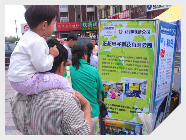 经过为时4天的活动准备, 联想电脑百城巡展活动在2007年7月8日顺利举行。在活动现场,我公司工作人员为广大顾客准备了天骄、家悦、锋行、笔记本等展区,多款联想笔记本电脑展现在消费者面前,供其选购,销售人员对消费者需求的商品进行现场销售。活动临近开幕时,联想笔记本电脑就以轻巧的外型,实惠的价格,可靠的质量和优质的售后服务,吸引了众多的群众,从熙熙攘攘的活动现场中我们可以看到联想笔记本电脑和我们正邦公司在绥芬河市消费者心中的位置得到有力彰显与印证。